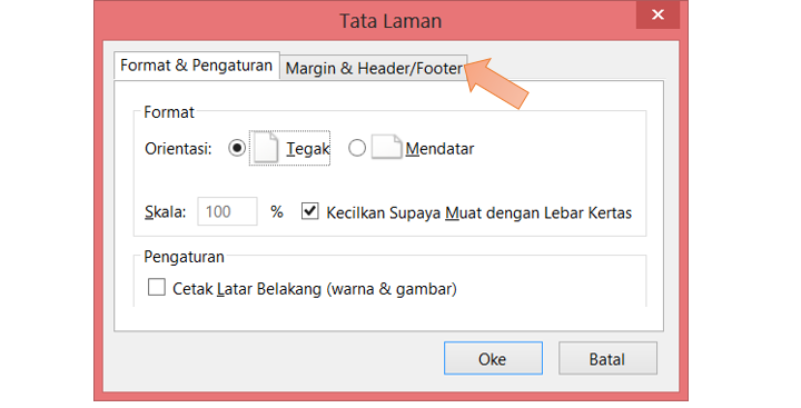 2. pilih File –> Page setup maka akan tampil seperti ini, klik margin&header footer