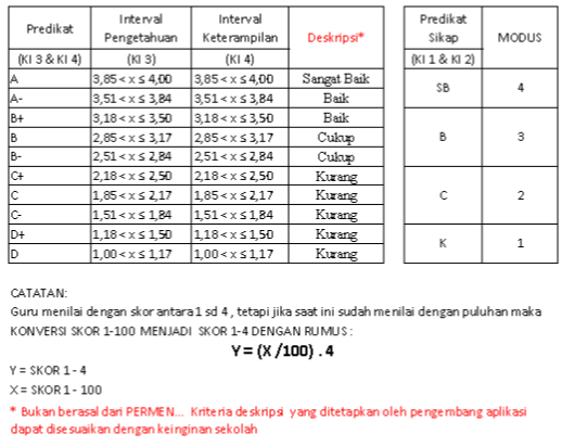 konversi nilai pada LPK (Laporan Pencapaian Kompetensi) / RAPORT didasarkan oleh PERMENDIKBUD NOMOR 104 TAHUN 2014 TENTANG PENILAIAN HASIL BELAJAR OLEH PENDIDIK PADA PENDIDIKAN DASAR DAN PENDIDIKAN MENENGAH (dikeluarkan pada tanggal 3 Oktober 2014 ) adalah sebagai berikut: